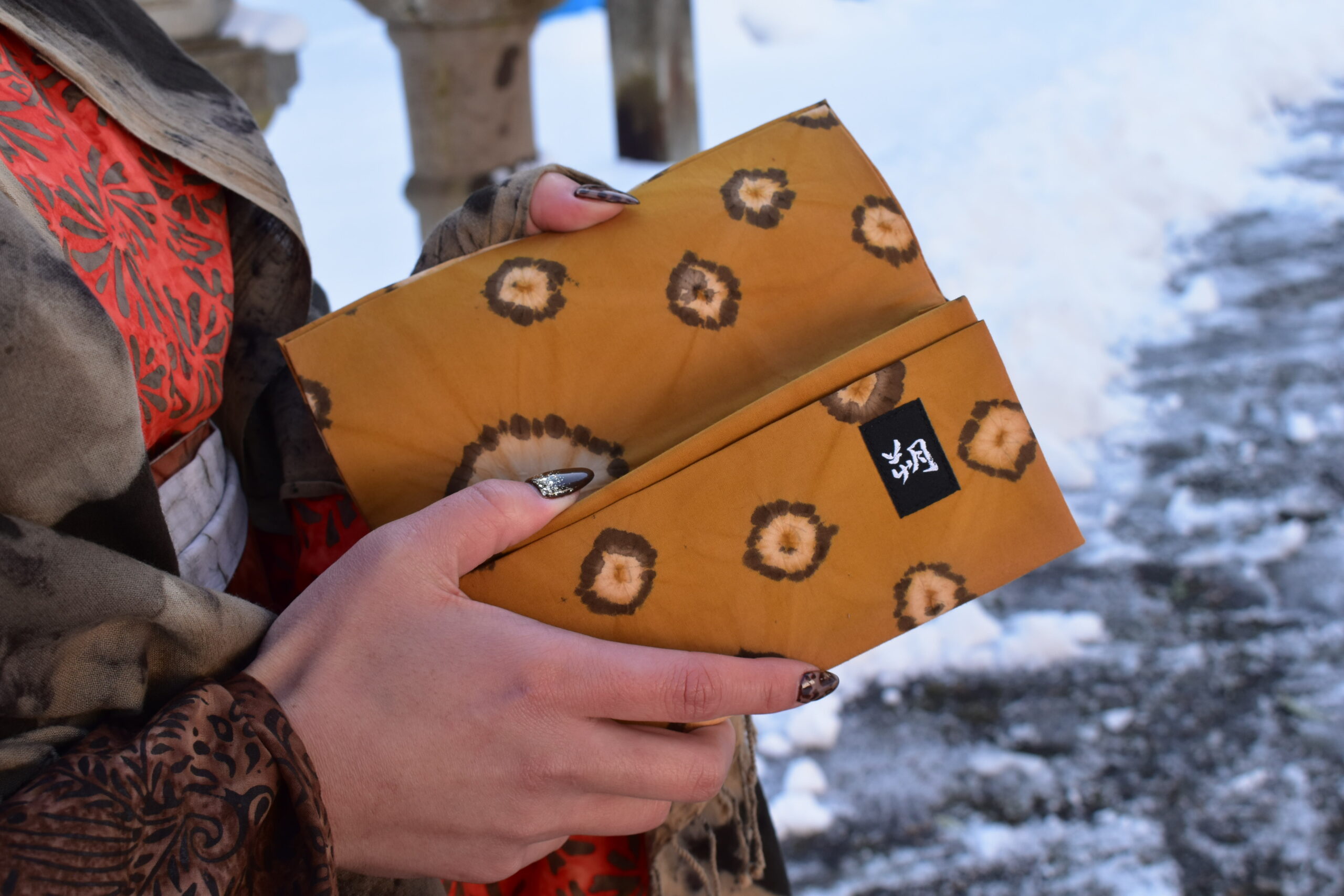 やわらかな辛子色に、絞り染めのような丸紋がリズムよく並ぶ長財布。