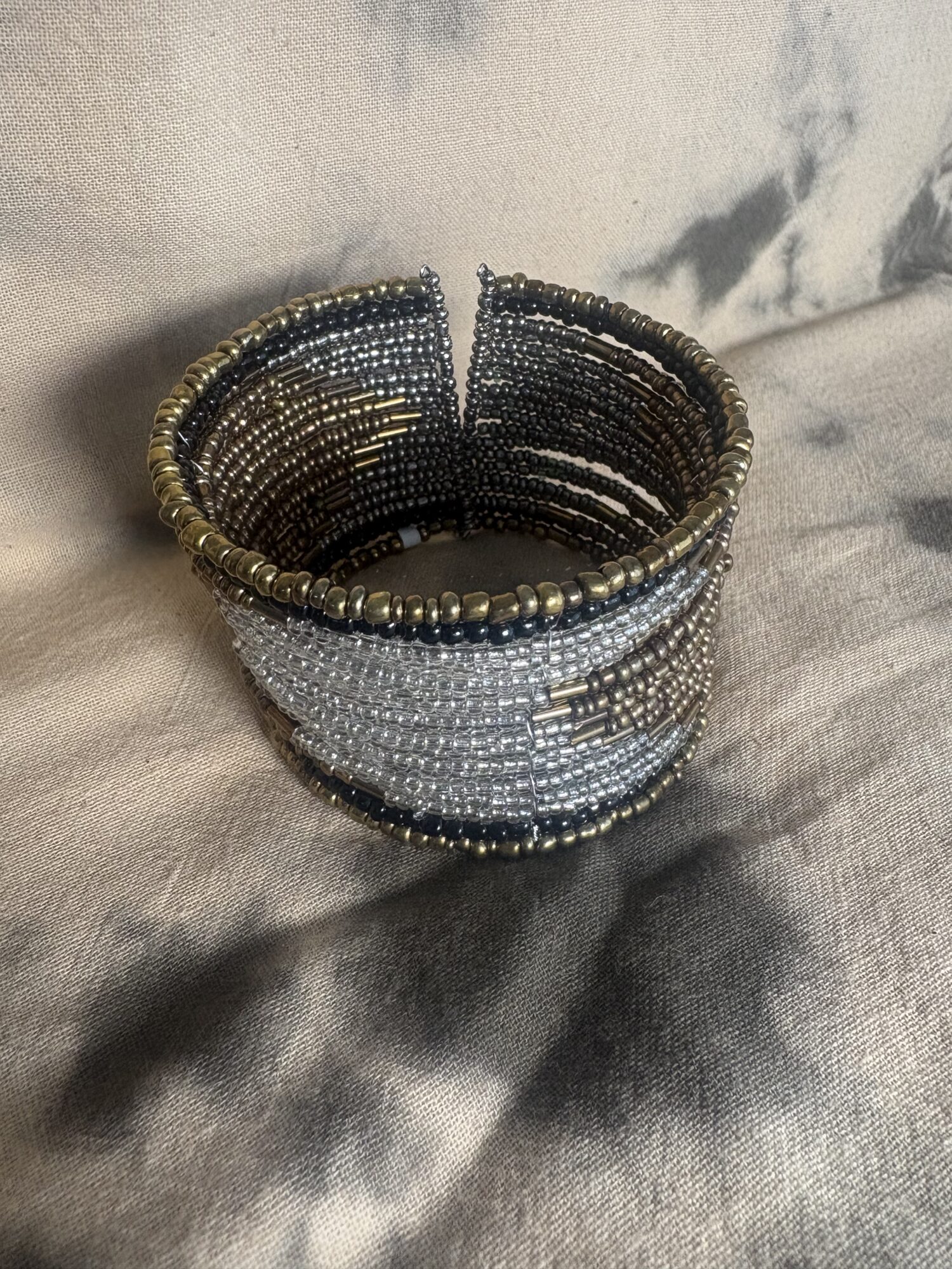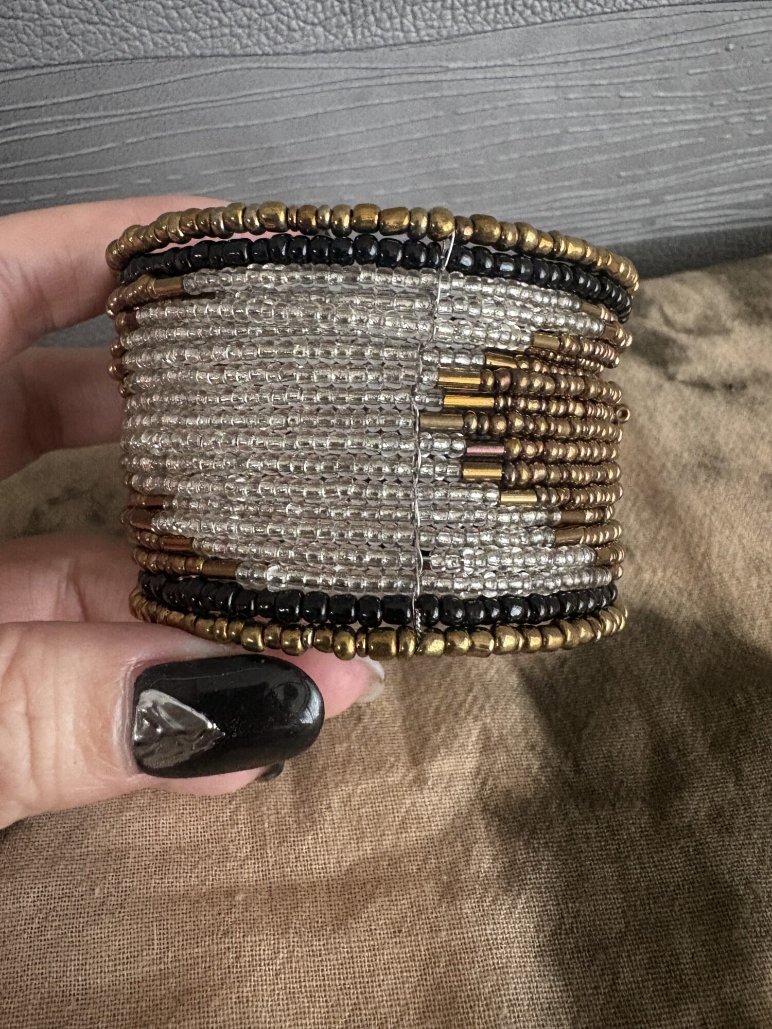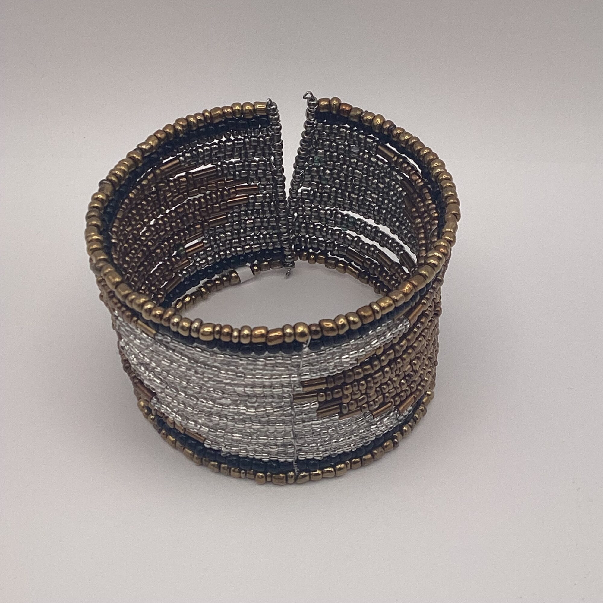 ゴールド・シルバー・ブラック・ブロンズ系のビーズを組み合わせ、横方向に丁寧に編み上げられており、シックで大人っぽい印象に仕上がっています。メタリックカラーのコントラストが美しく、角度によってさりげなく表情が変わるのも魅力です。