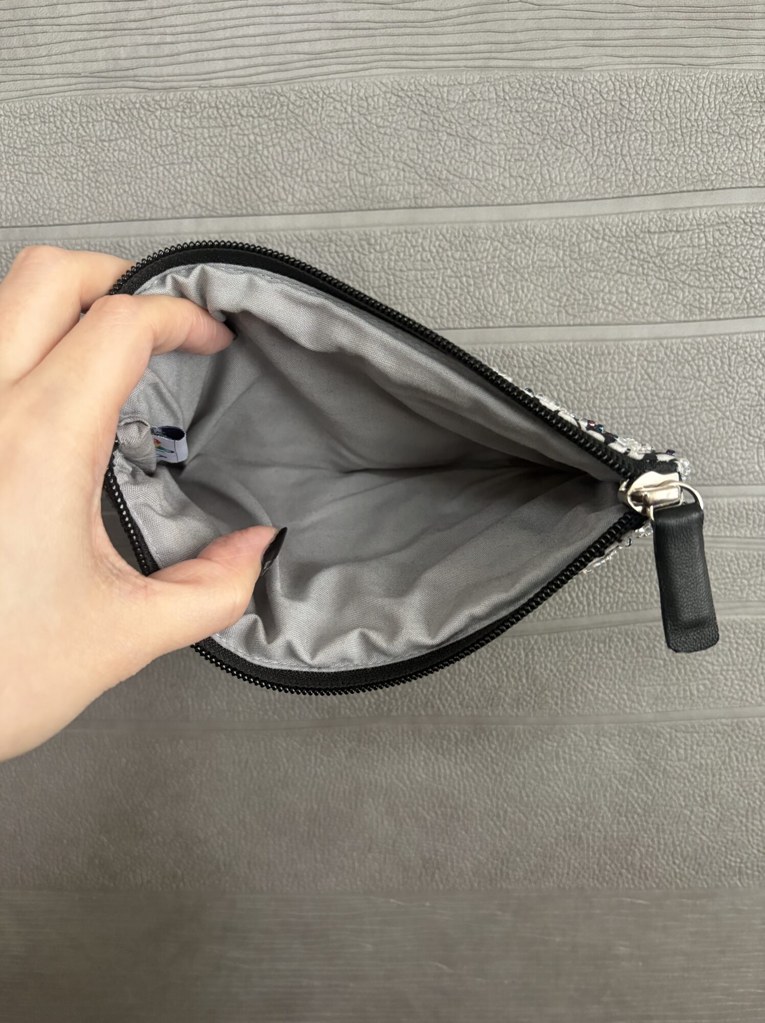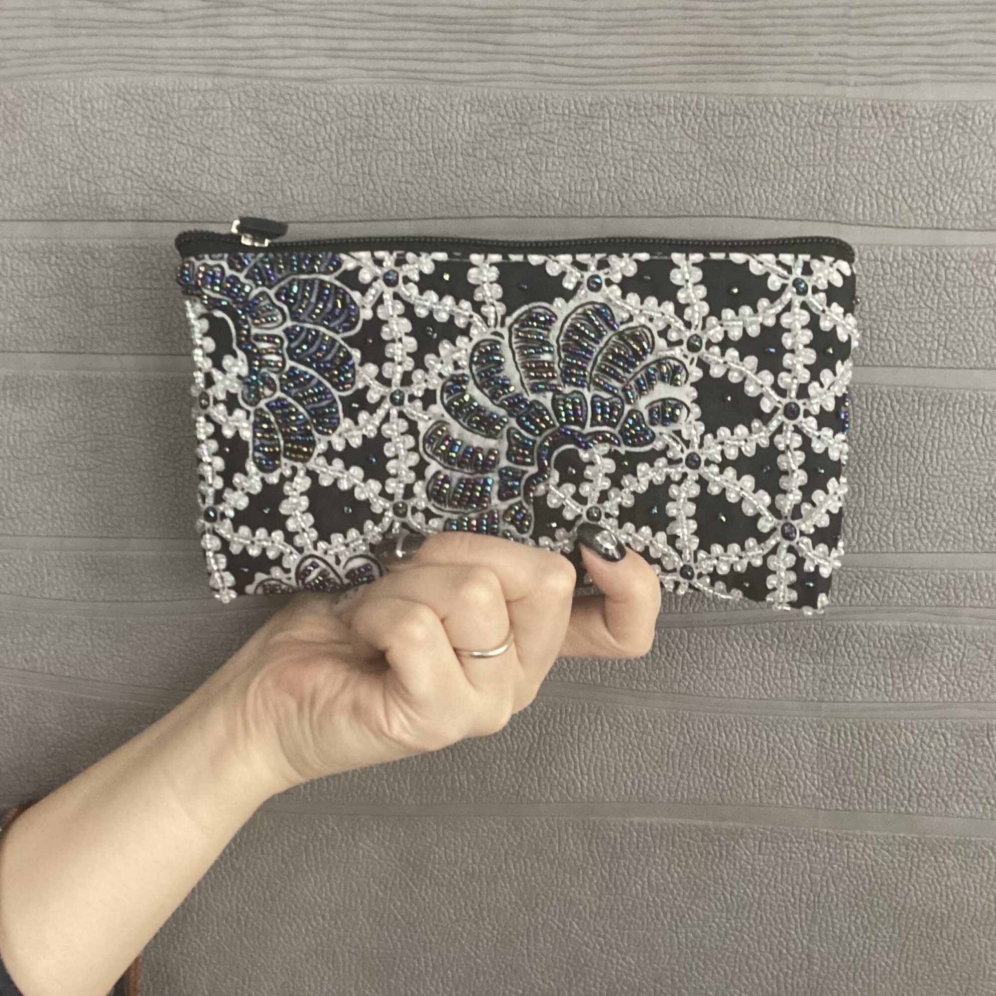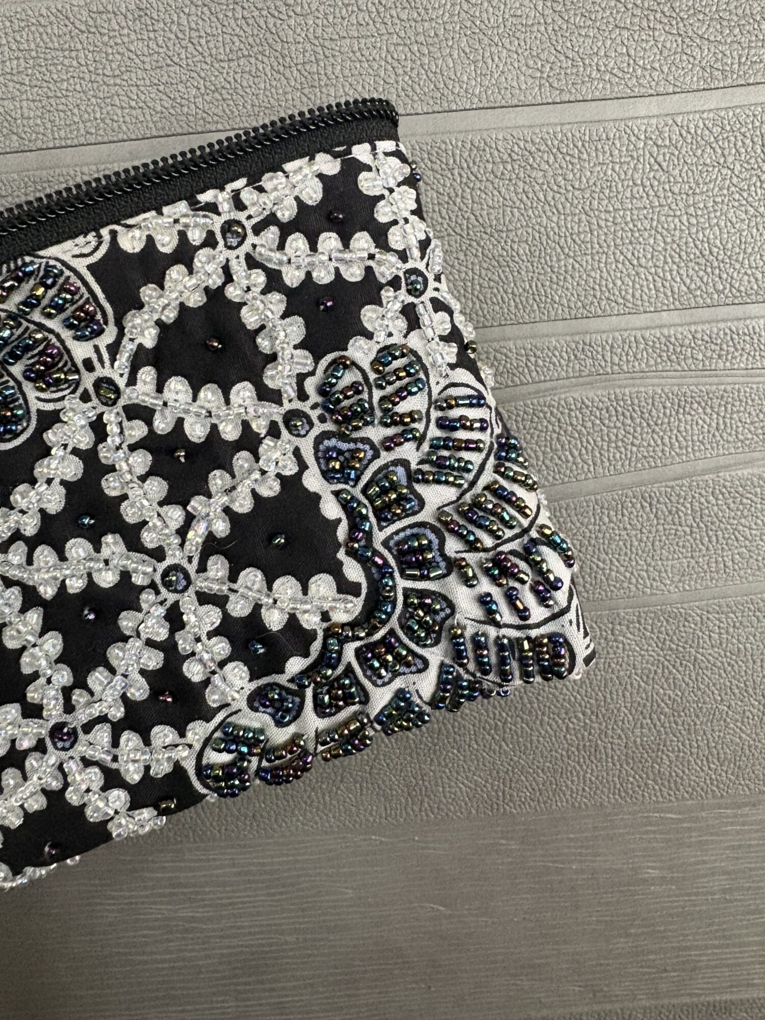 黒地の生地に、繊細なビーズ刺繍を贅沢に施したポーチです。