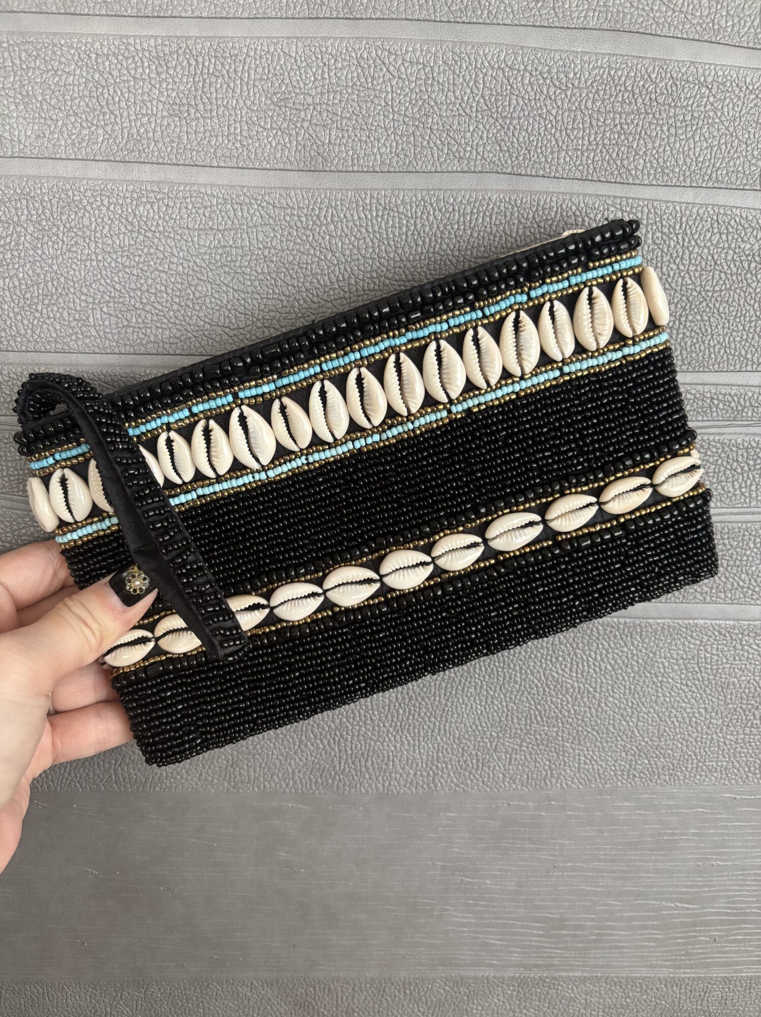ビーズ刺繍とシェル装飾が印象的な、エスニックテイストのクラッチバッグです。