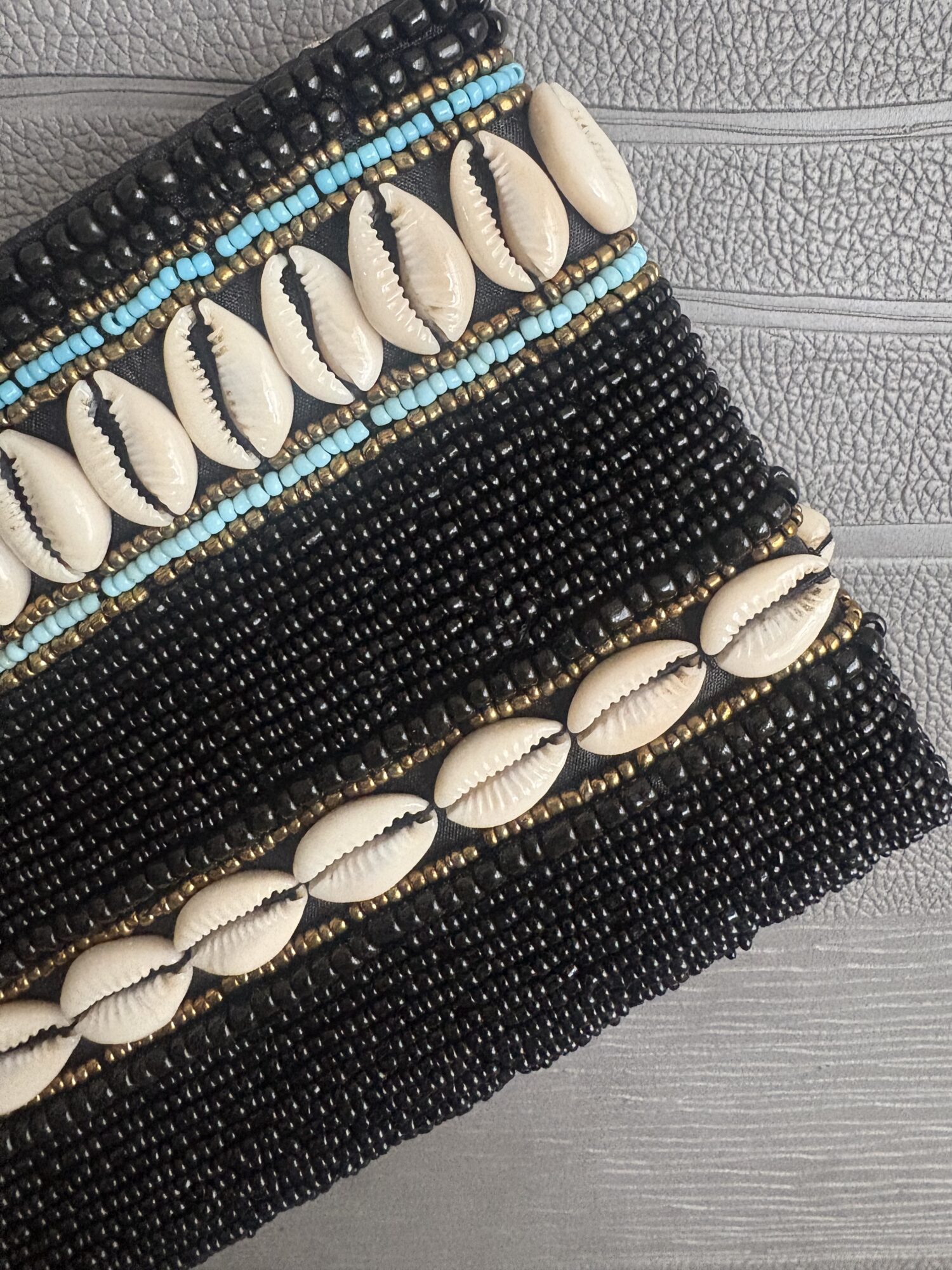 ブラックを基調に、細やかなビーズ刺繍とナチュラルなシェルを贅沢にあしらい、上品さと存在感を兼ね備えたデザインに仕上がっています。アクセントとして入ったターコイズカラーが、全体に爽やかさをプラス。