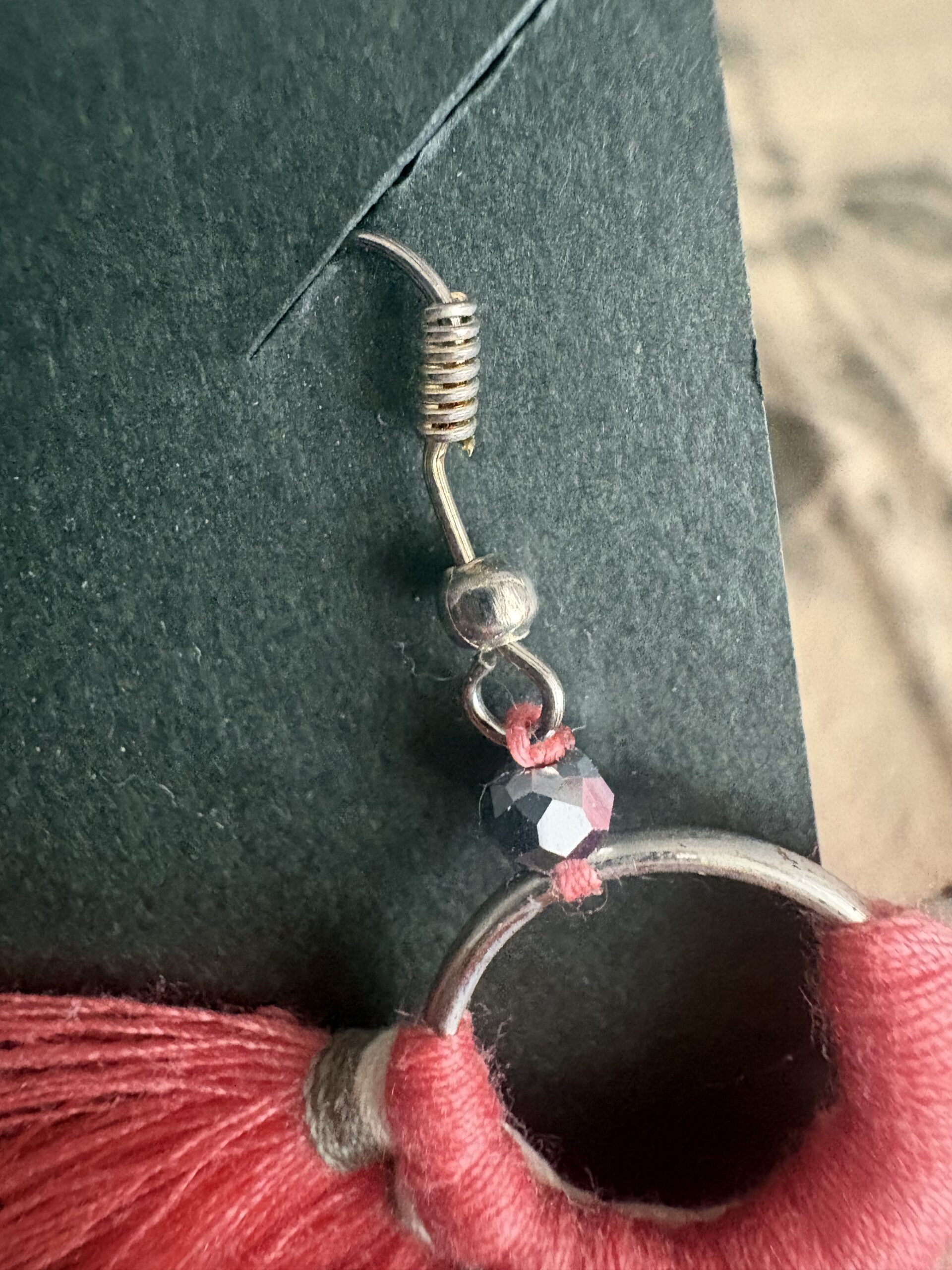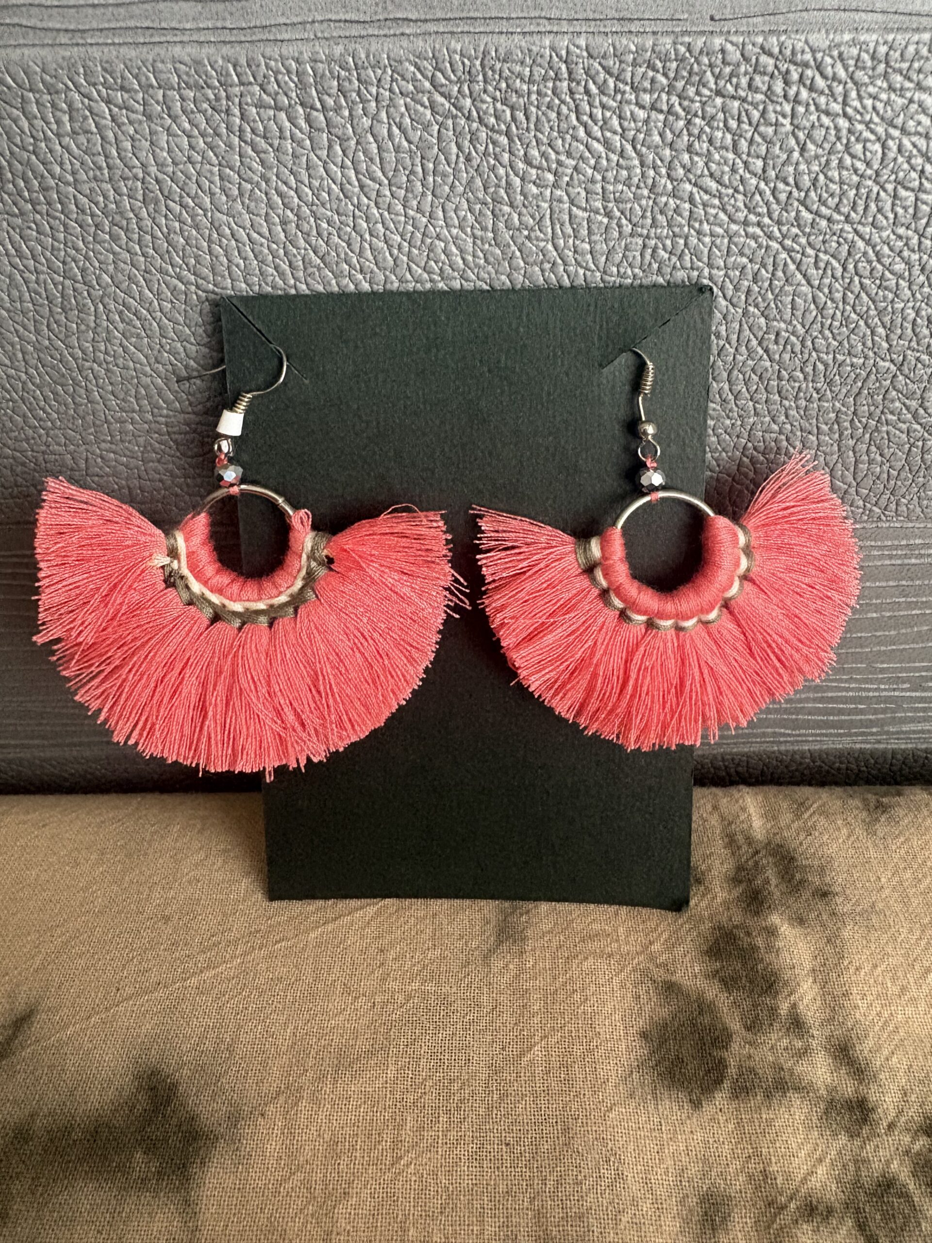 鮮やかなコーラルピンクのフリンジが目を引く、存在感たっぷりのタッセルピアスです。