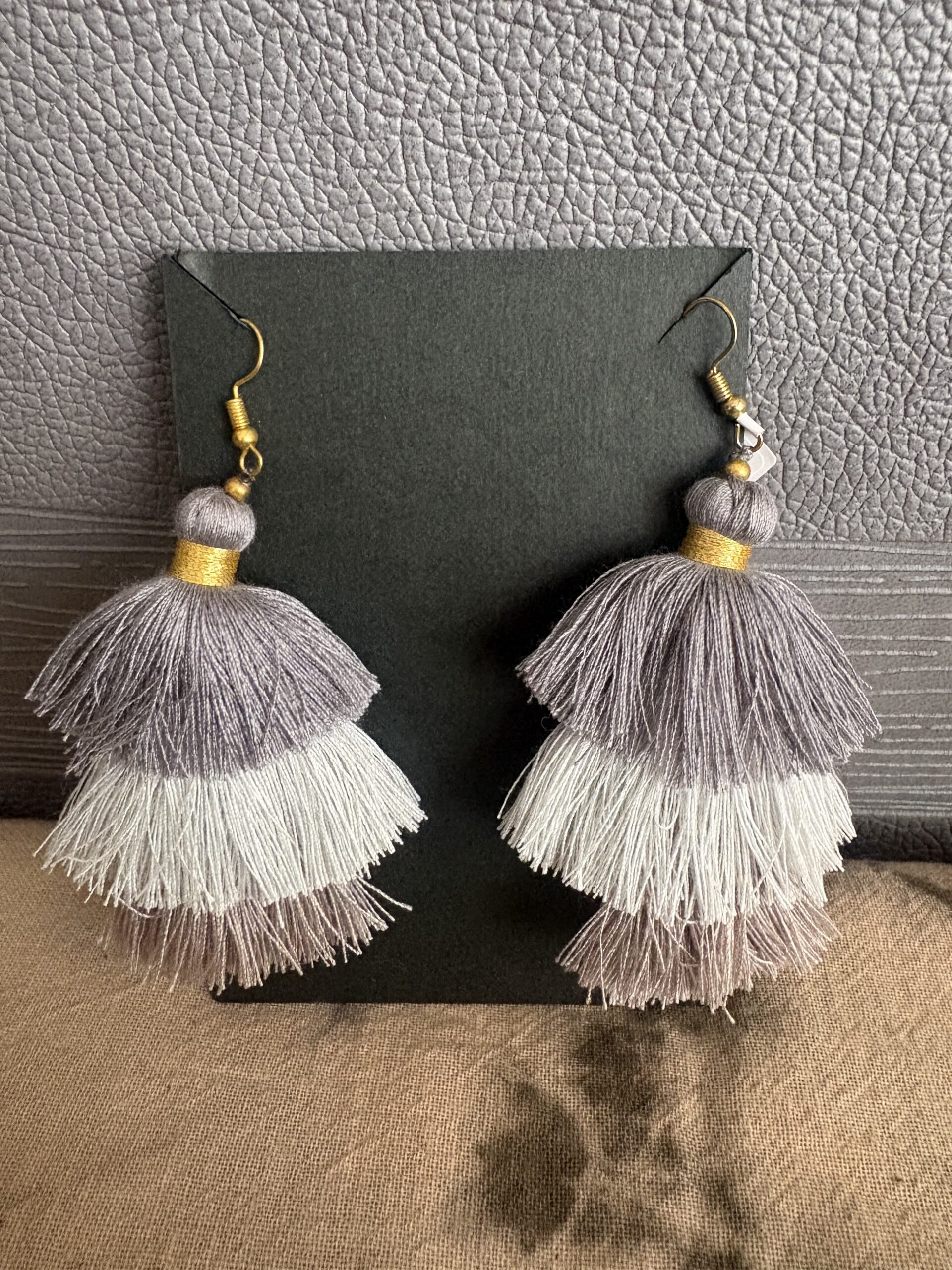 落ち着いたグレートーンを基調に、ダークグレー・ライトグレー・スモーキーグレーの3色タッセルを重ねたデザインで、動くたびにふんわり揺れるのが魅力。