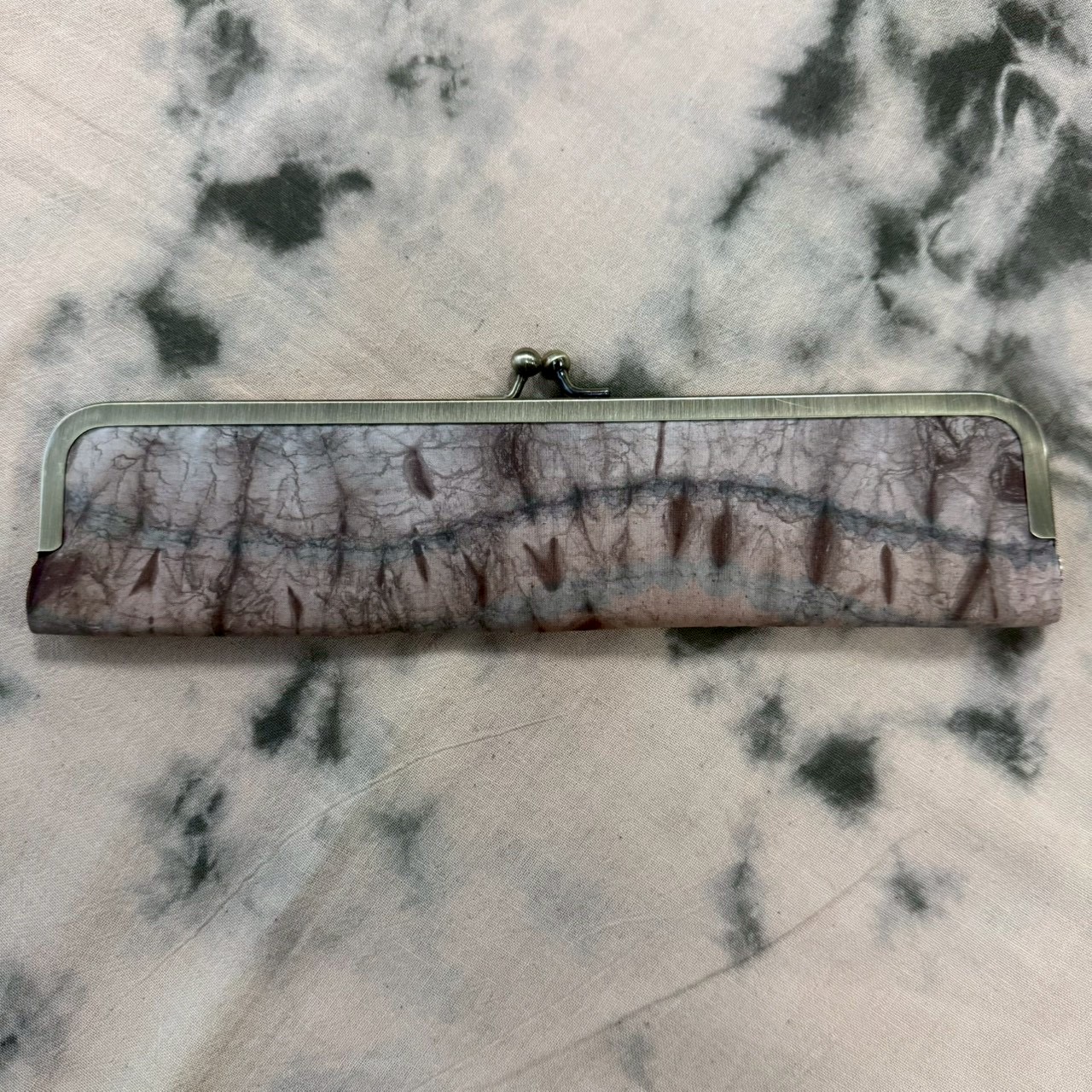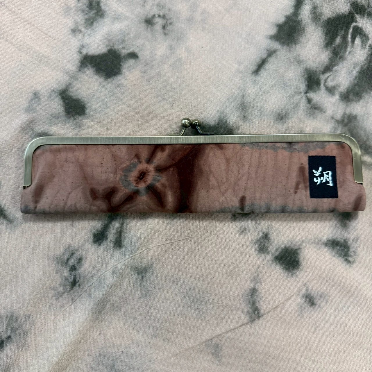 落ち着いた茶系の生地に、絞り染め風の模様が映える和テイストの扇子入れです。